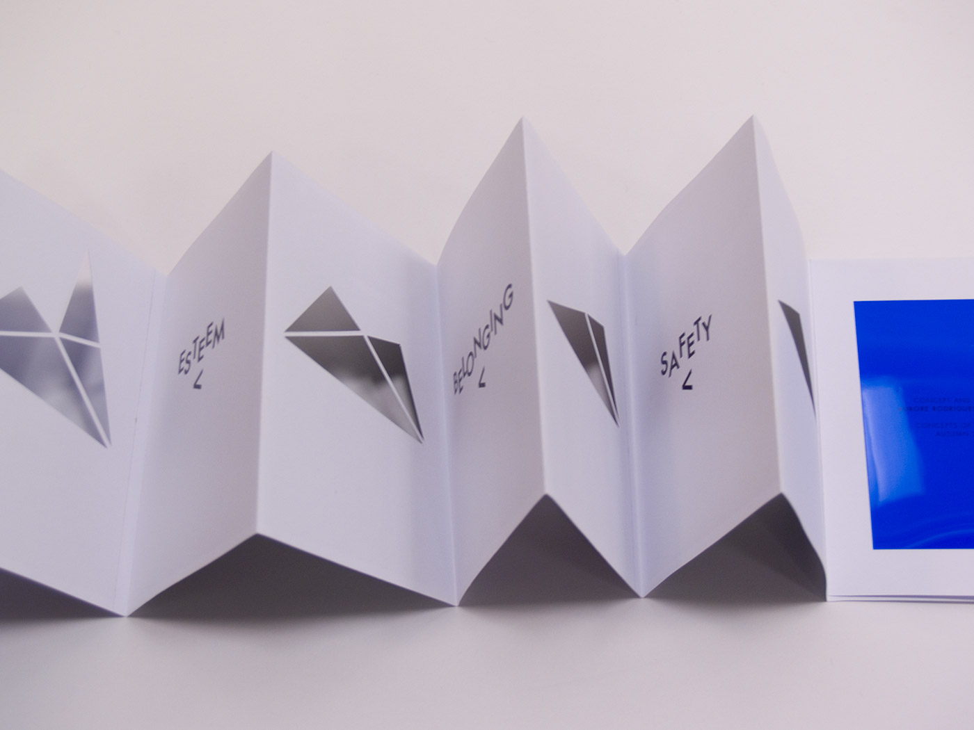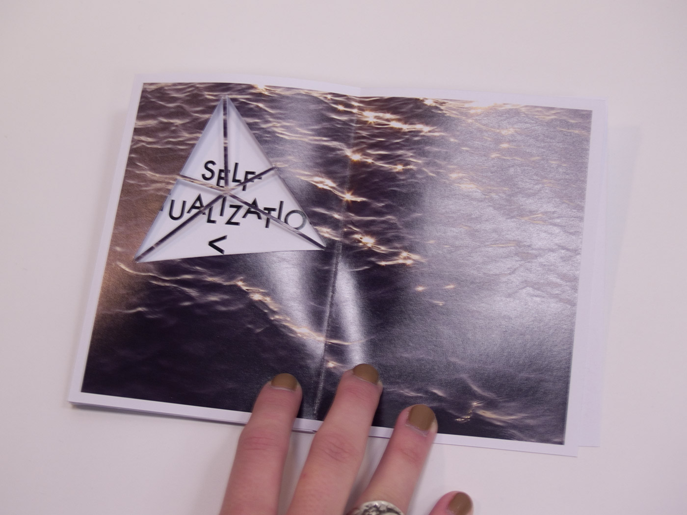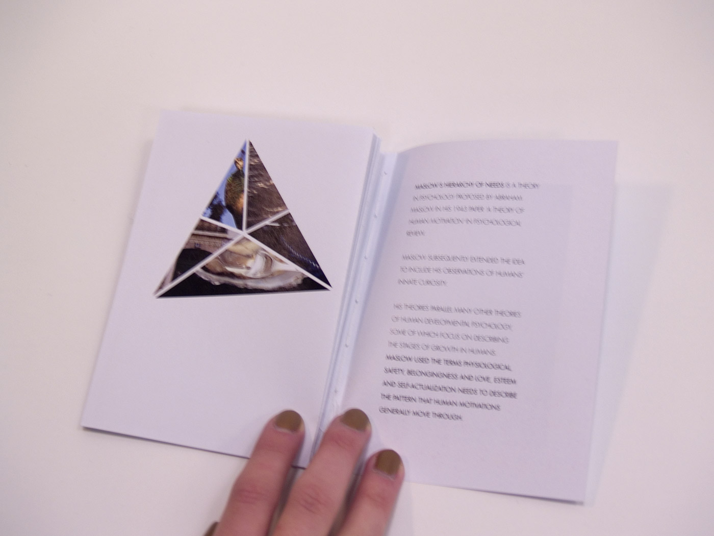 Maslow's hierarchy of needs is often portrayed in the shape of a pyramid, most fundamental and material levels of needs at the bottom and needs more complex and psychologic at the top. I try to represent it in my book, in which each picture represents a need of the hierarchy and each cuts represent the level on the pyramid.