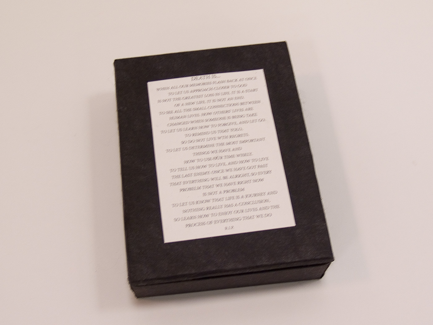 The book allows readers to decide to read the gravestones from the positive side, or the negative side of the book. It all depends on the person’s attitude. Once the reader opens the coffin box, he will start experiencing the progressing journey about death through the pictures, beginning from either the black and white photos or the color photos.