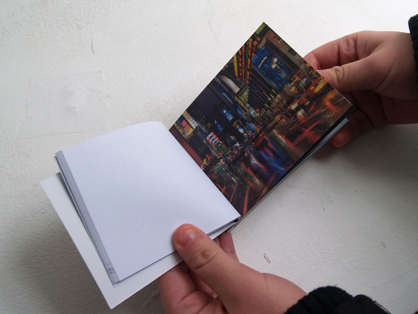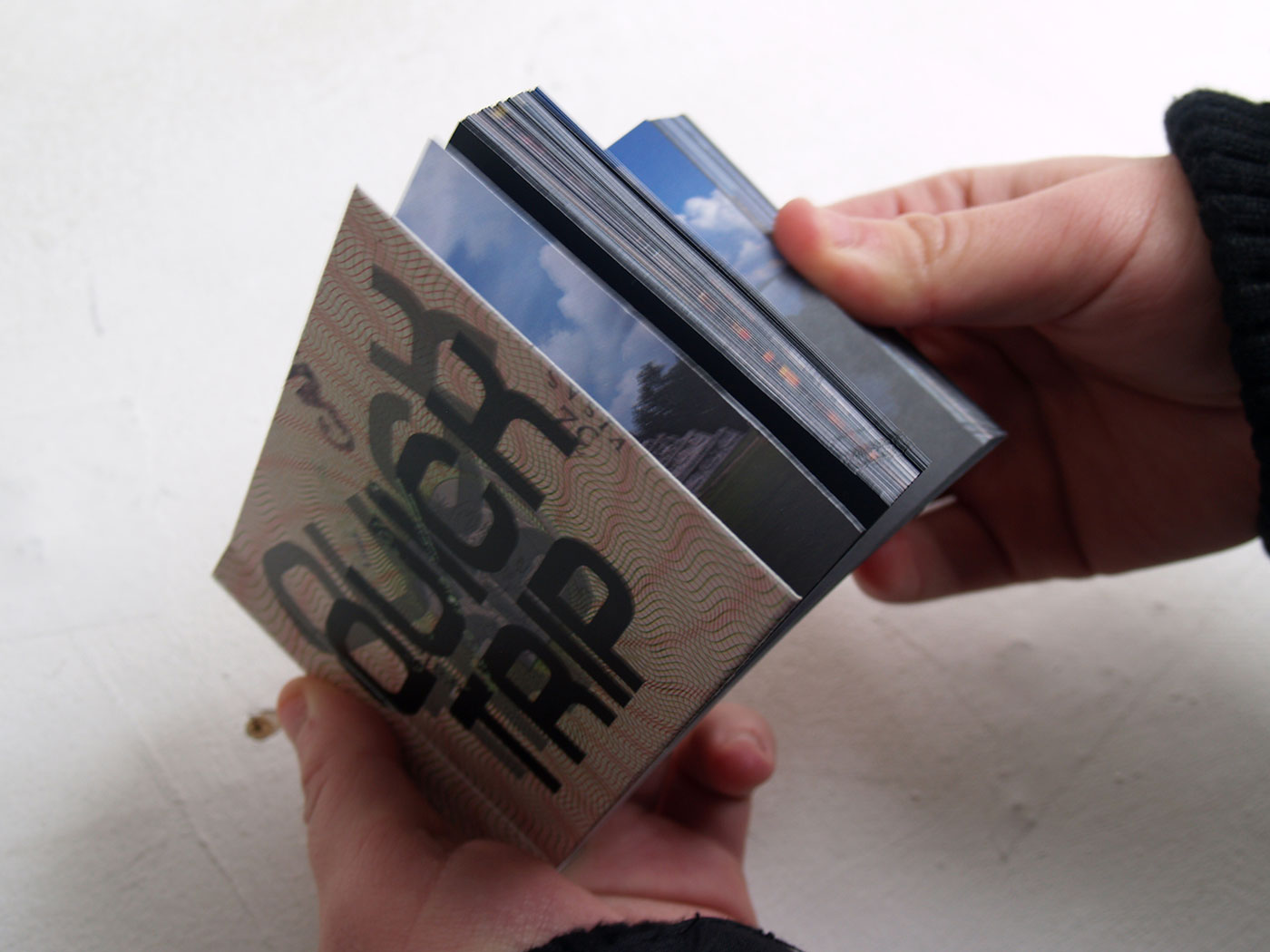 A little book full of adventure. This works as a demonstration of a trip by just having some views. The trip is all around the world and the black pages are the plane hours that it takes you from one place to another. The point of this flip book is to look at it quickly, just to see a hint about the trip.