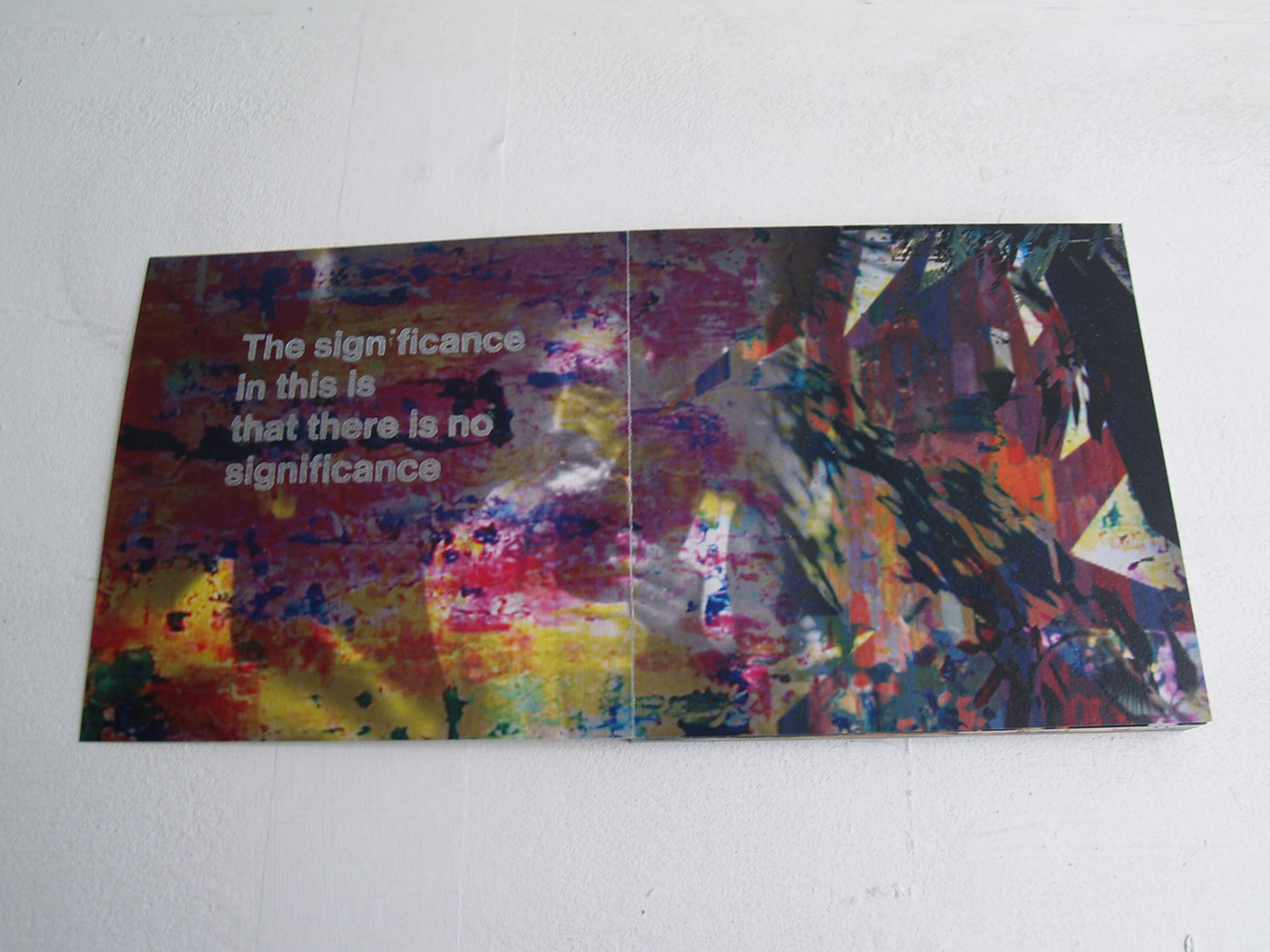 The book is in a square format and centered the title to contrast the definition of amorphous. All of the text is in Helvetica, because it is a very known font and very identifiable. This also contrasts the book's meaning, along with its perfect binding. Inside the book reveals twenty-three spreads of imagery, randomly selected from the given class photos. Each spread uses four pictures. The images produced have no concept behind them. The text in each spread is made up of weird thoughts that come to mind when I studied the images. They do not play apart of the meaning of the image, but they may create a connection. The text is letter pressed to create a more amorphous look as the ink transferred is not always consistent. The main goal in this book is to have the viewer create their own conceptual connection about each spread, without there actually being one.