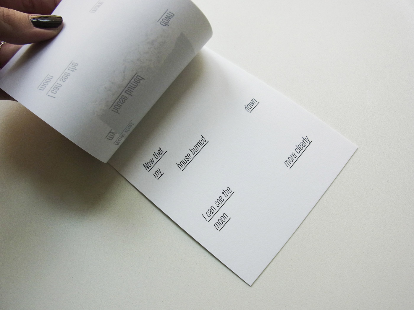 My concept is inspired by a poem of Mizuta Masahide about minimalism. Step by step each page reveals a new letter of the final message "Now that my house burned down I can see the moon more clearly." By ripping off the pages the reader himself reduces the chaos in order to see the pictures and the text more clearly.