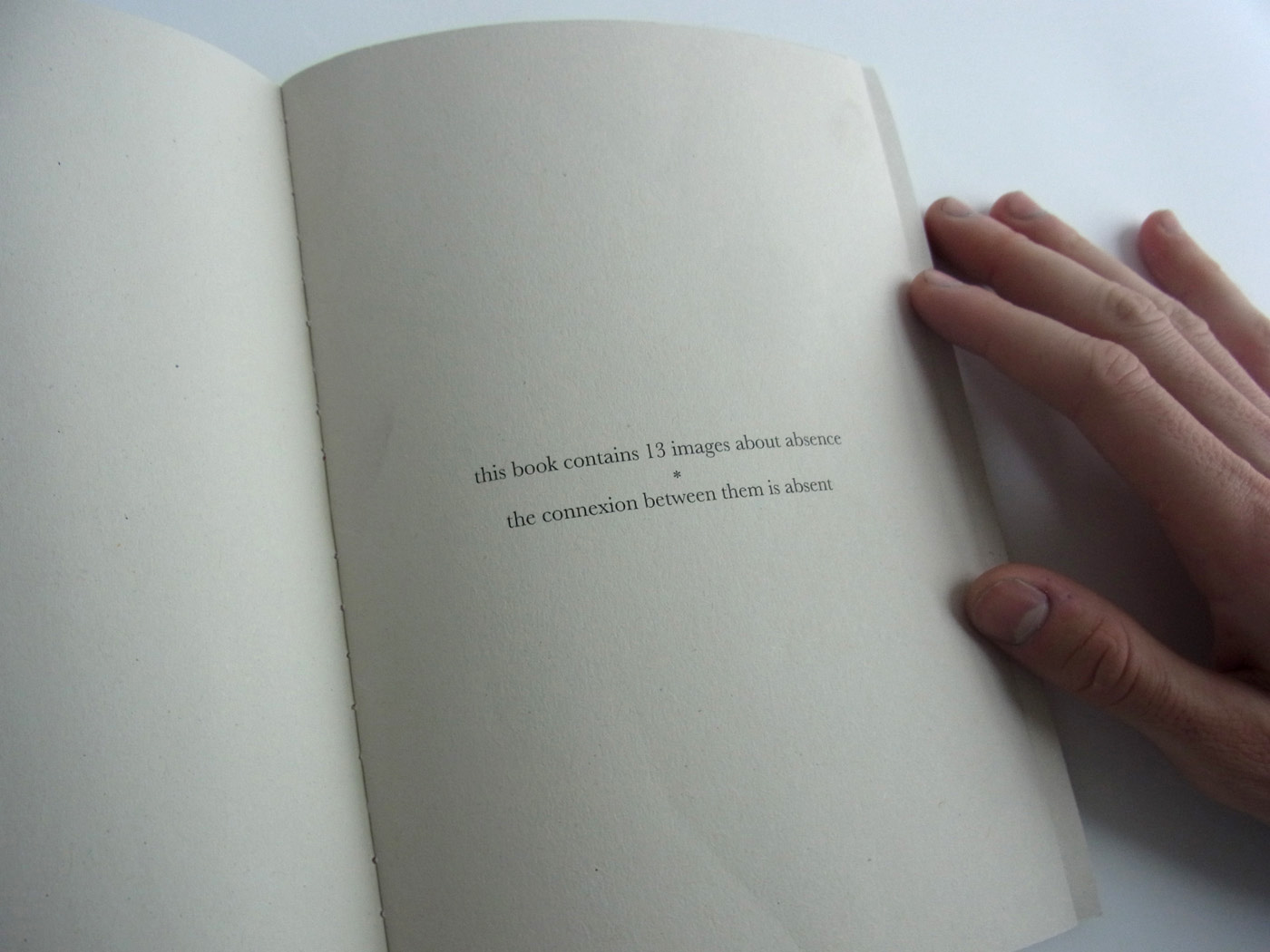 The book is a collection of 13 random images without any clear connexion between them but the absence of a important part of it, relying the fact that something is always missing. The design of the book intends to create a nostalgic feeling, creating a link between image an memory, as the fact that we forget important parts and images of our own histories.