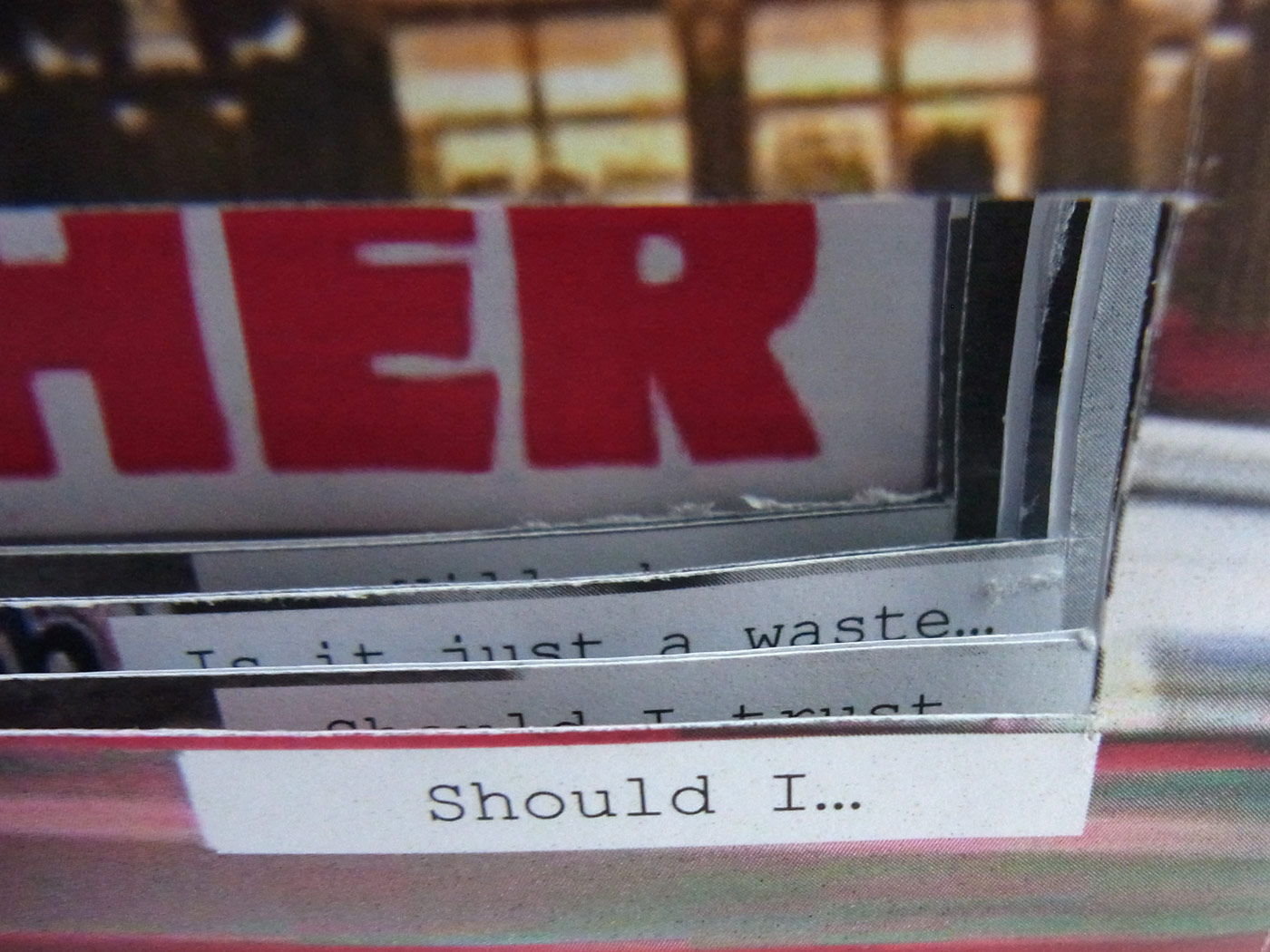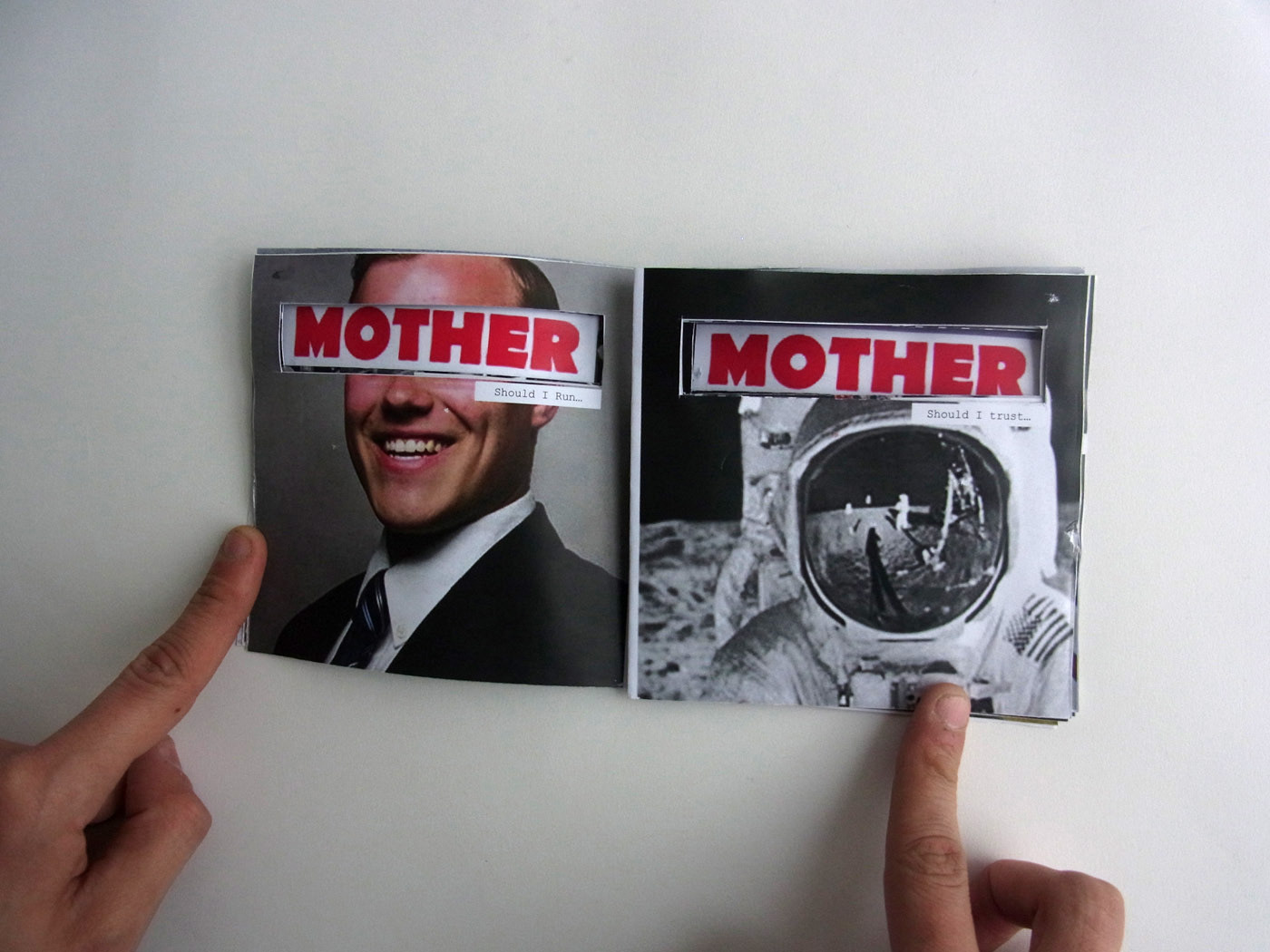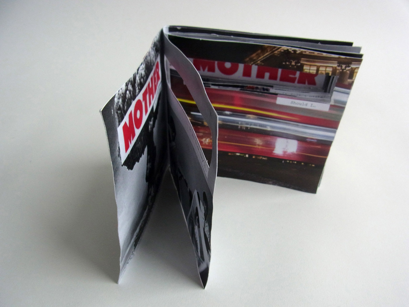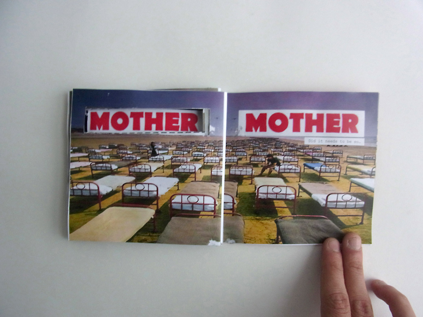 Using as an inspiration and reference the lyrics of the Pink Floyd song “Mother” (The wall, 1982), the book tries to illustrate in a way the lyrics of the song, even though inside the piece the only thing that appears written are the first 3 or 4 words of each paragraph of the lyrics, leaving to the reader the description to imagine or interpret in his own words what the images and the text are trying to express (could be the actual lyrics or whatever the reader want to), the piece is displayed in the format of an old compact disc booklet, to give that sense of nostalgia to the piece, so it could be interpreted as the little booklets that came with the Album and you can follow the lyrics of the song or see the process of the album development.