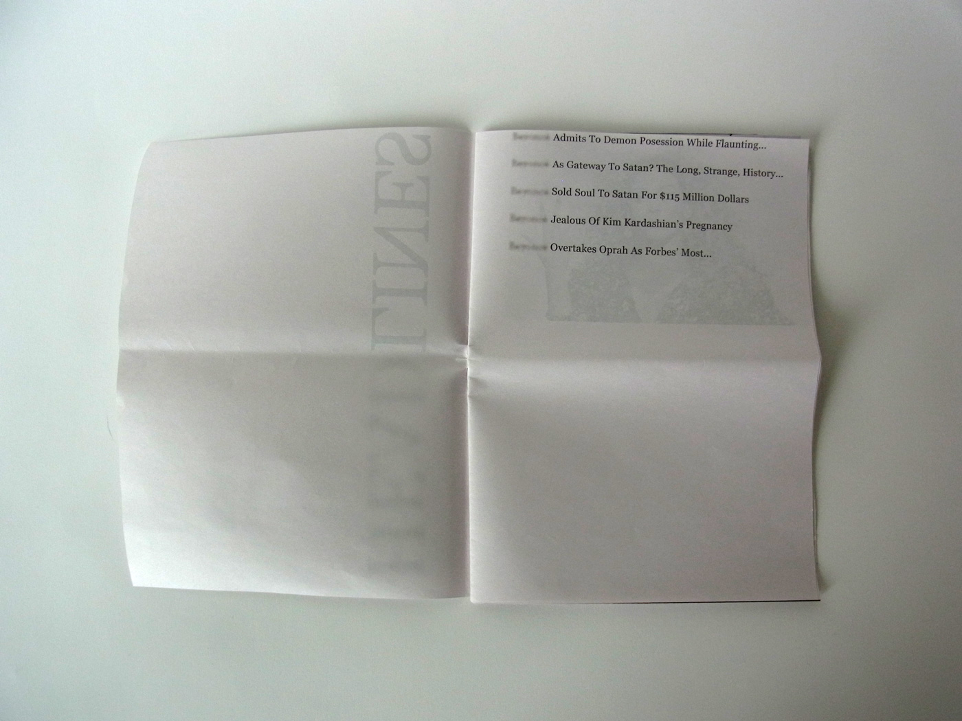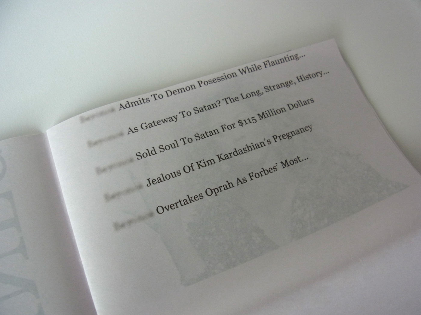 The photograph is simply a picture of Beyonce holding up her hand, yet the headlines are outrageous. This holds true for other images dragged into Google from the class pool. For this project I portray the first 5 Headlines that come up when dragging each photograph into google. The image is then revealed on the following page of the book. The purpose of this is to draw attention to how media constructs false meaning from photographs and how an image can be interpreted by viewers however they please. To make my book ever more of a surprise reveal for the viewer, I blur out the subject of each image in the Headlines. By reading the headlines on the page before seeing the image, viewers are forced to imagine the visual solely from the text. This leads to a surprising reveal when the page is turned and the real image is revealed devoid of meaning.
