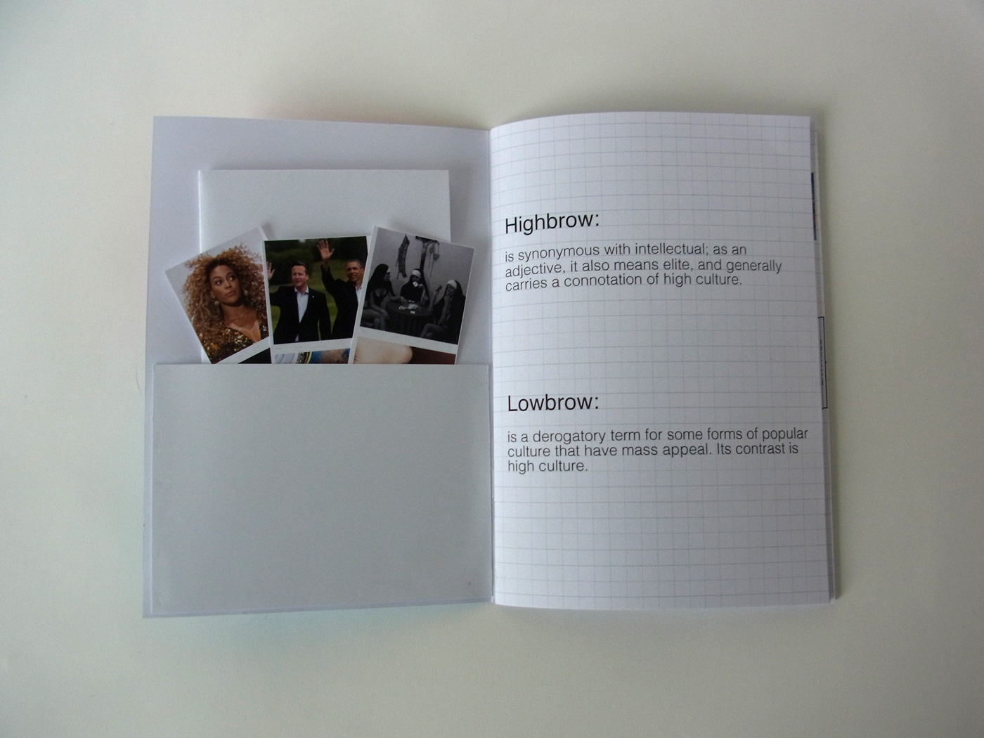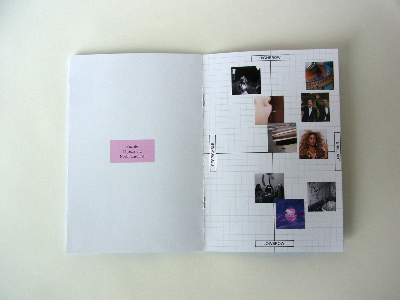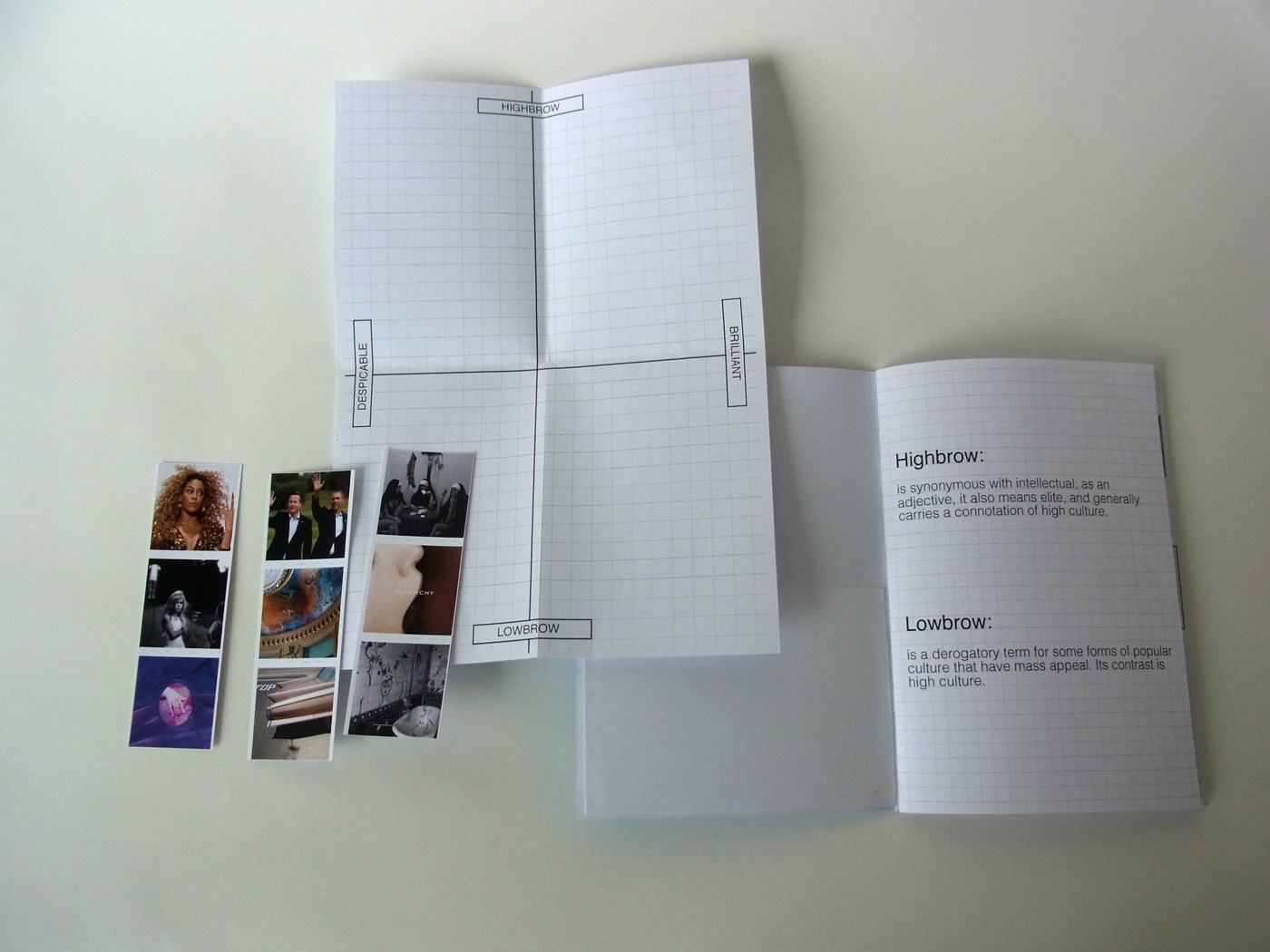 This book was created to show the differences in how people view the terms highbrow and lowbrow. Given very basic definitions on the first page, readers are then prompted to place the images how they see fit to the grid given. Throughout the book, readers can then read and see how people of all ages and origins perceived these images as well. I wanted the book to feel similar to that of a work book or a coloring book, but also have the cover be swiss inspired with contrast. Which further reinforced the high/low aspects.