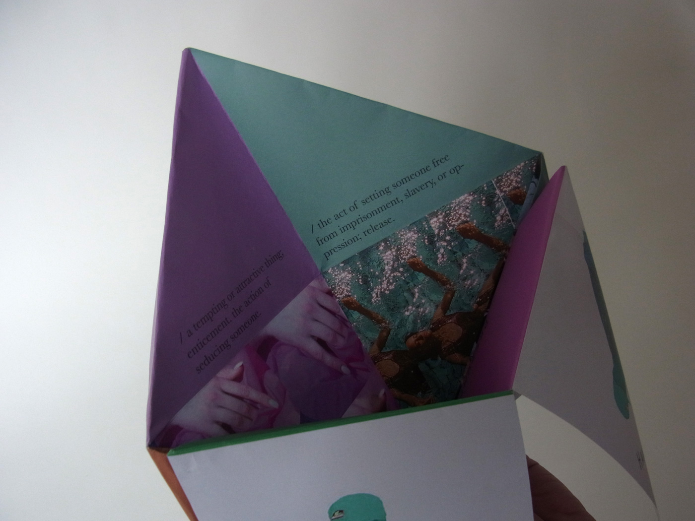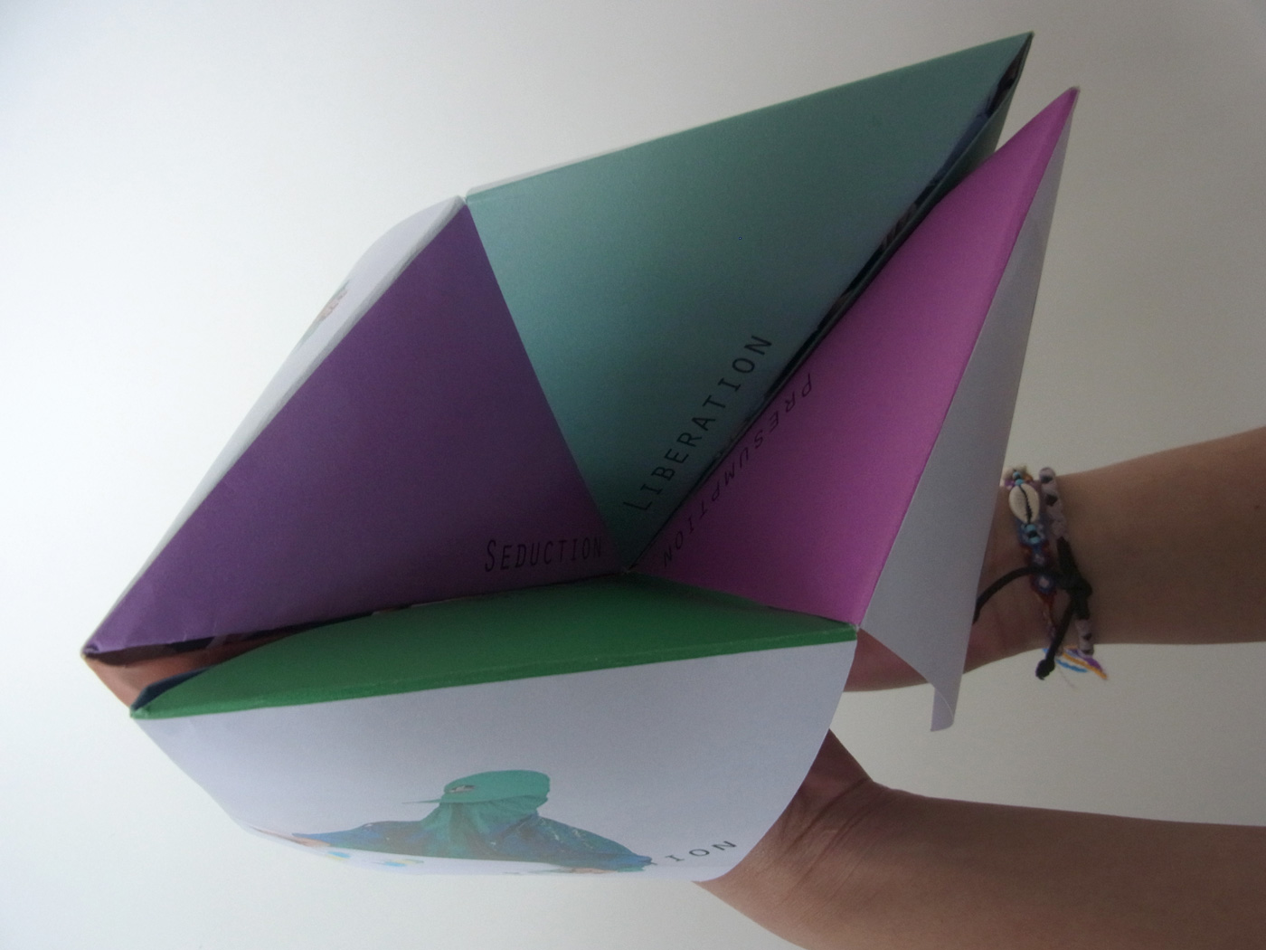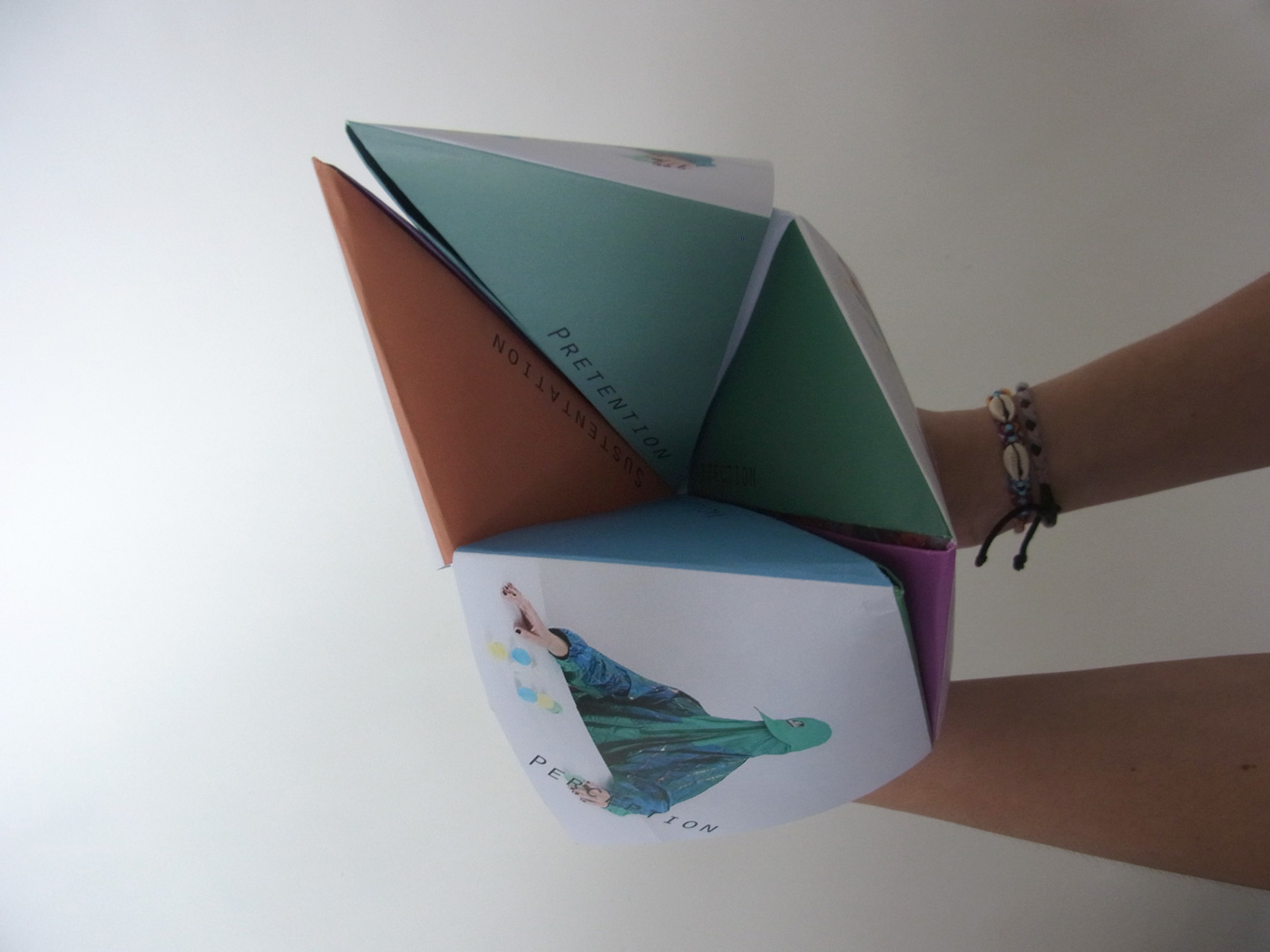 I curated a list of words that, for me, the photos described depending on how the hands where placed. The project consists in how the person interacts with the paper by folding, assembling and playing with it, therefore using directly the hands. Then by choosing each word, a short meaning is shown for the person to know what the hands reflect and by seeing the picture, have a visual example of this reflection.