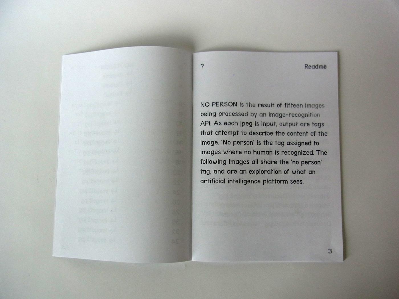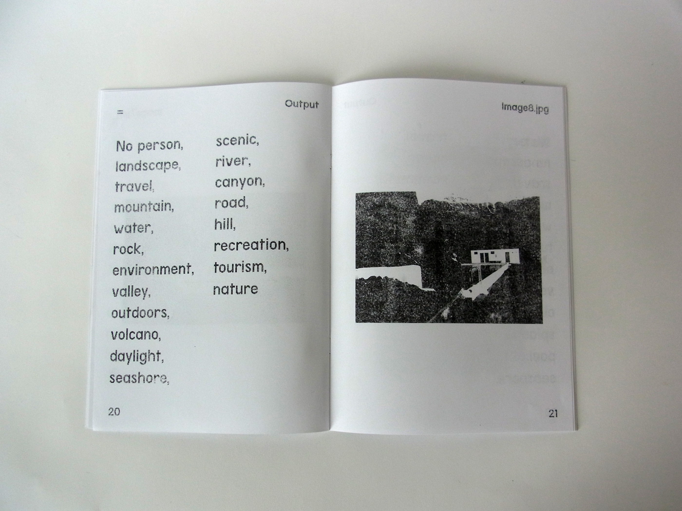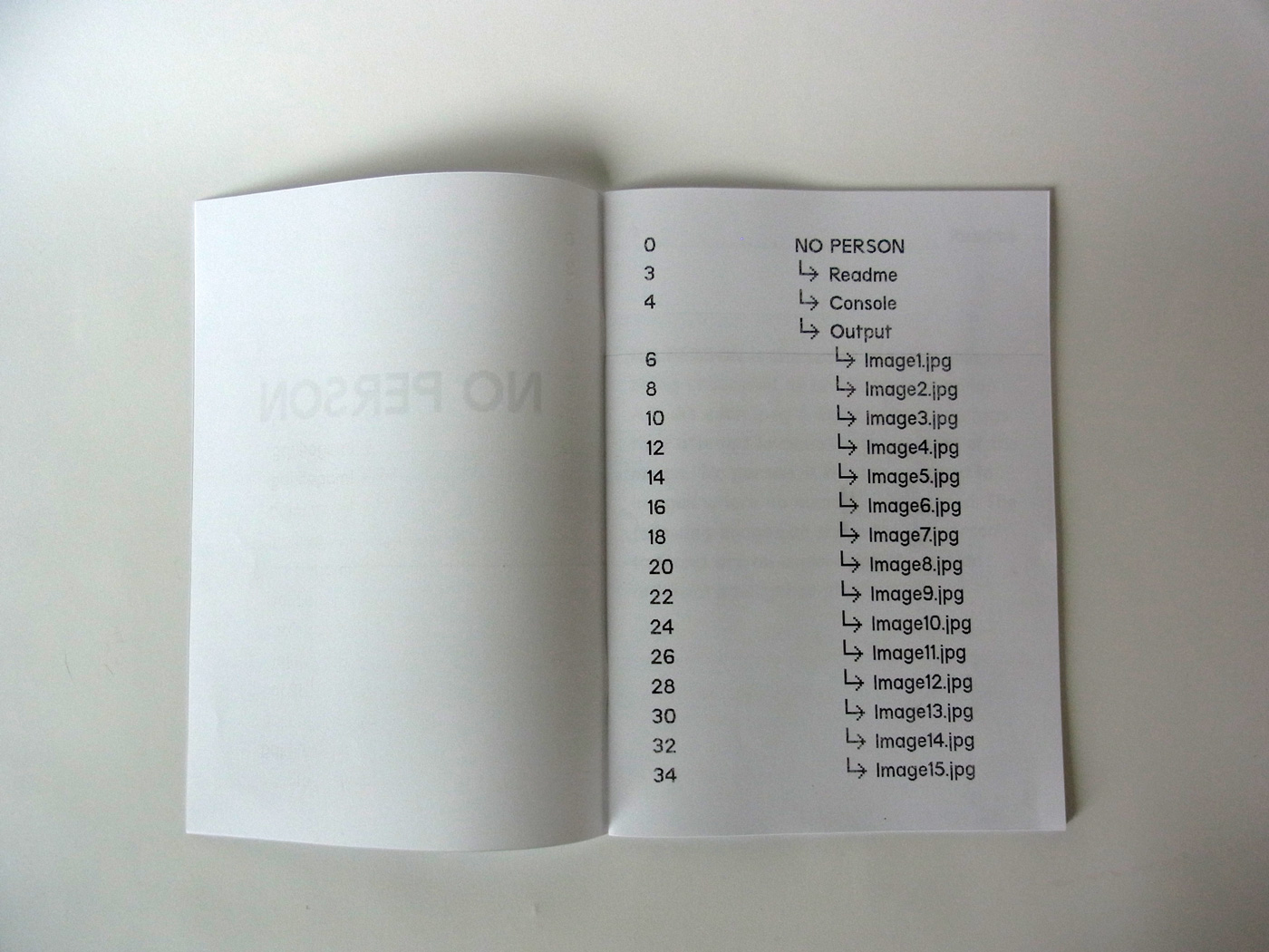 NO PERSON is the result of 15 images being input through an image-recognition API. Output from this process are tags, attempts from the neural network to identify visual components of the images. ‘No person’ is the tag assigned when no human is found to be present in the image.